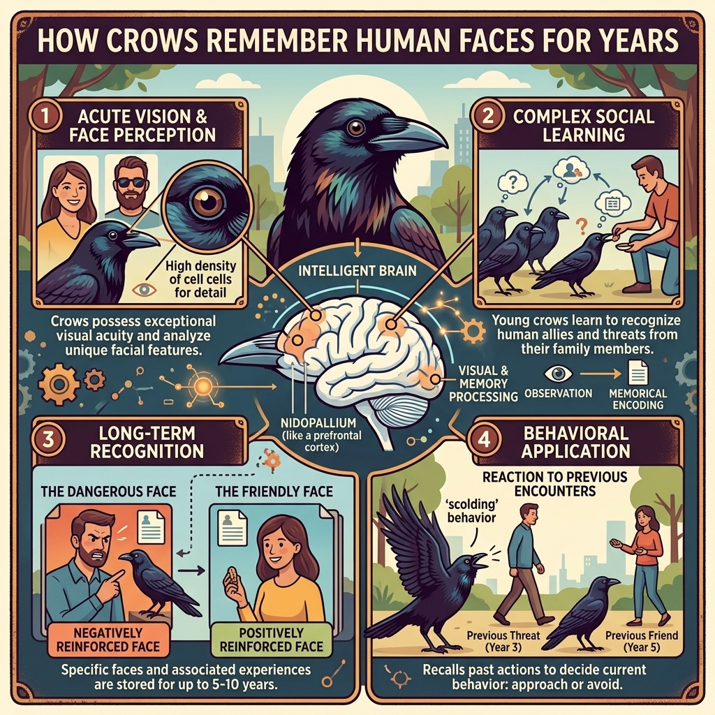 Scientists have discovered that these birds can recognize human faces and remember them for many years. Even more fascinating, they can share this information with other crows.