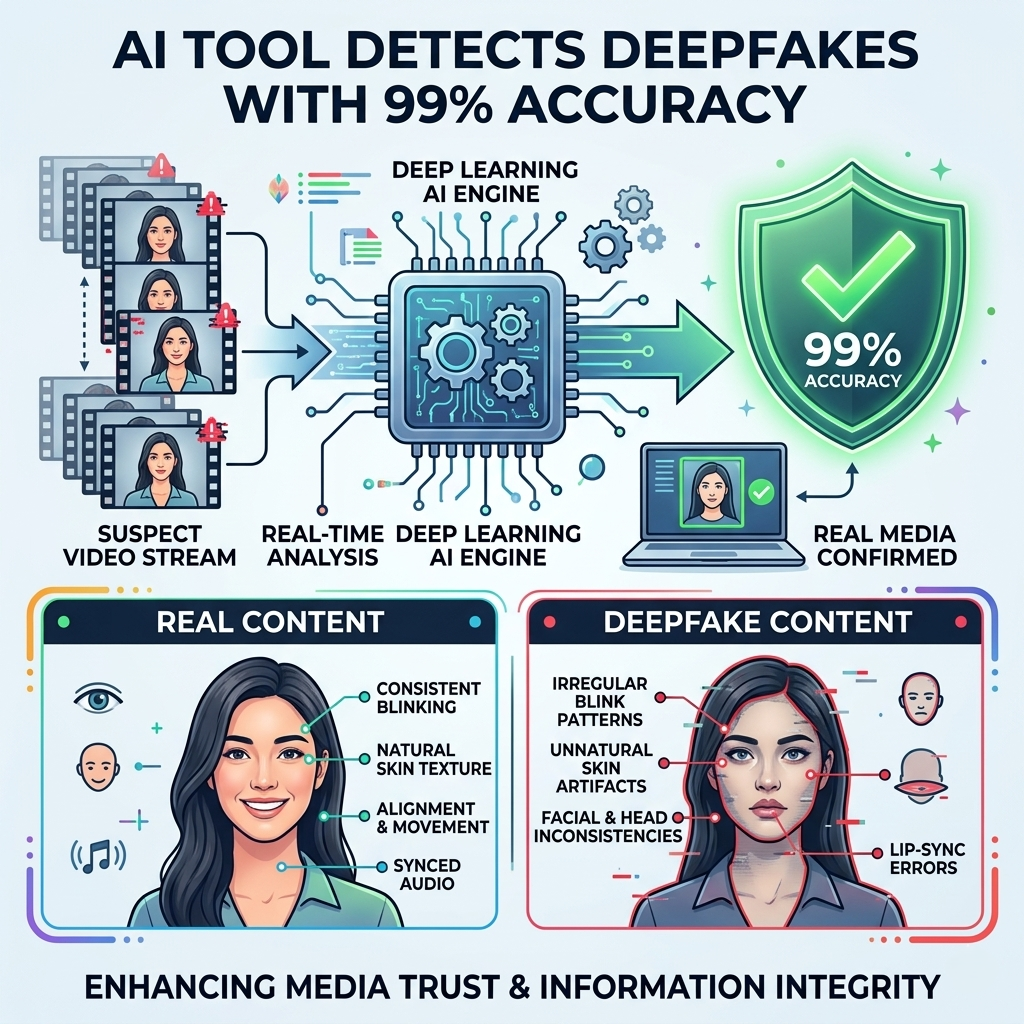 During testing, the system achieved 99.1% detection accuracy, even against some of the most advanced deepfake generators available.