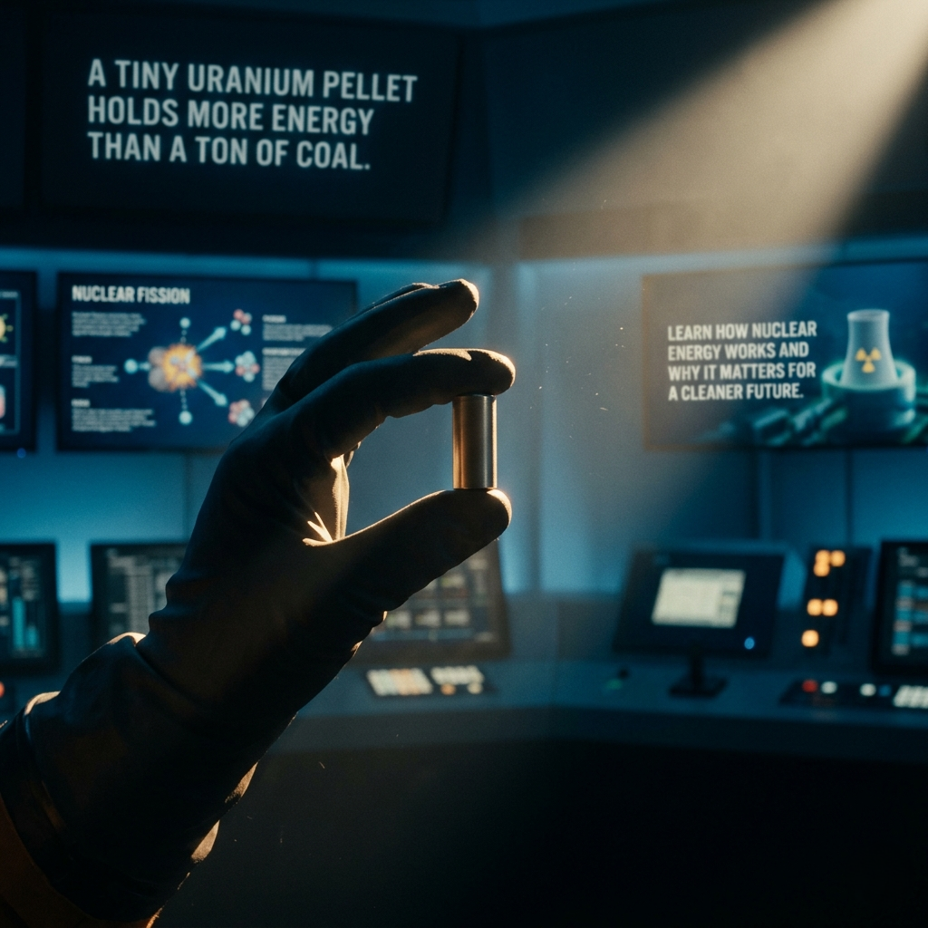 The comparison between a tiny uranium pellet and a ton of coal clearly shows the power of nuclear energy. While coal relies on bulk and combustion, uranium delivers massive energy in a compact form.